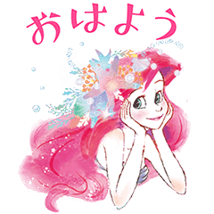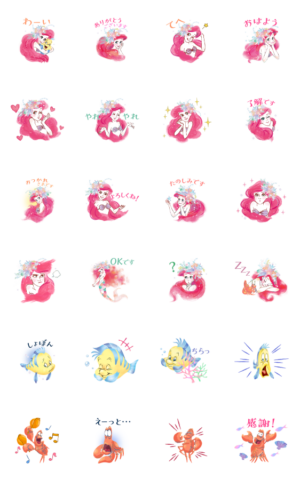 水彩画タッチの優しく鮮やかなスタンプ。アリエルの髪色が鮮やかできれい!