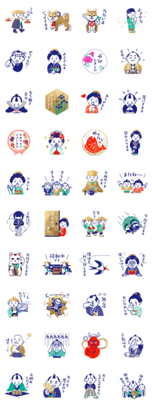 日常の和のスタンプ第二弾。よく使う挨拶から、ちょっと使いたい昔の言葉まで。 和風/敬語/着物/侍/舞妓/忍者/俳人/茶人/近江商人/柴犬/おかげ犬/仁王/瓦版/まねき猫CADRE より発売