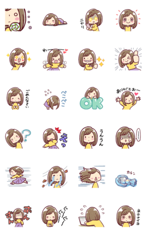 ボブヘアの娘、水彩タッチの[動く]おもしろスタンプ。動きや表情でくすっと笑いを誘うスタンプです。