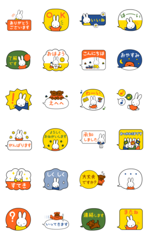 かわいいうさちゃん、ミッフィーのスタンプです。吹き出しの中や上にミッフィー達がいて、動きます。とても目立つので伝えたいメッセージをしっかり相手に伝えられます。