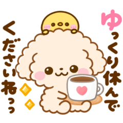相手を思いやる気持ちを伝える言葉を詰め込んだトイプードルのスタンプです。日常で毎日使える言葉もたくさん入って幅広く使えます♪ぴよたぬき より発売
