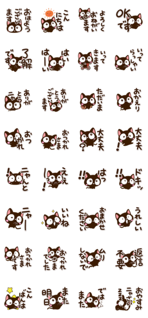 『小さい黒猫』のかわいい便利なクロネコスタンプ。くろねこの、あいさつスタンプ。かわいいキャラ好きな方にぜひ。【かたこ】毎日楽しい・基本・ミーム・挨拶・可愛いかたこ より発売