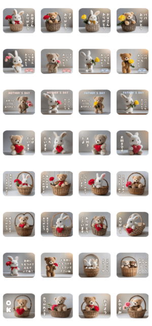 母の日&父の日スタンプです。お母さん&お父さんへ日頃の感謝の気持ちを込めて送りましょう!ママ/パパ/ありがとう/メッセージ/カーネーション/薔薇/花/ぬいぐるみ/実写
