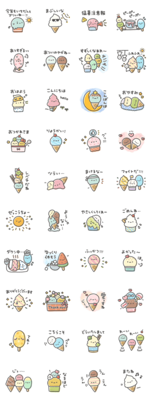 夏の暑さとたたかうアイスたちのスタンプ第2弾です。挨拶などの毎日使える言葉も入っています。kazunoco より発売