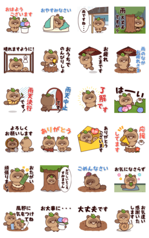 お話するのが楽しくなる日常の言葉や雨に関するワードがたくさん入っているので、これからの季節にとっても便利!ぽんぽこでかわいいタヌキくんの飛び出すスタンプです!