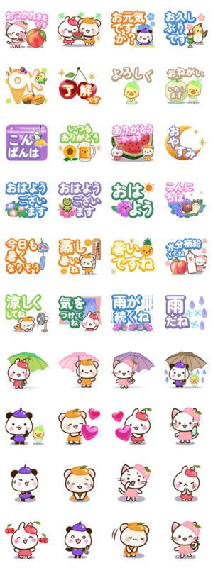大きなデカ文字で使いやすいスタンプアレンジ機能に便利なスタンプ♪うさぎ・パンダ・ひよこ・くま・ねこが果物の姿で登場♡かわいいインコも♪/敬語/暑い日/父の日/紫陽花