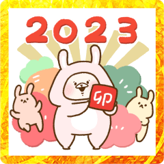 新年のおめでたさがあふれるスタンプです。うさぎの被り物をして、可愛い。