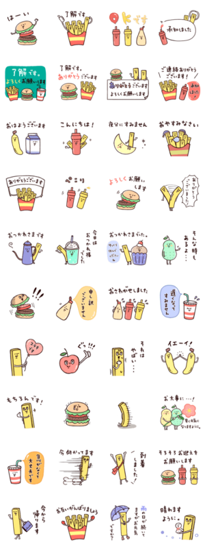 敬語・丁寧言葉のスタンプセットです。長文多め。家族や友達、上司や先輩にも。カラフルで元気に使えます。ハンバーガー/ジュース/バナナ/ポップ/ケチャップ/マスタード