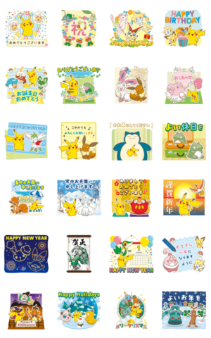 大切な人へのお祝いや季節の挨拶を、ピカチュウたちがお届け。ポケモンがにぎやかに飛び出す、メッセージカード風スタンプです。