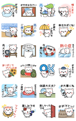 アメリカンショートヘア―のアメちゃんの、梅雨から夏に使える便利なスタンプです♪よく使う気づかいのメッセージもたくさん♥