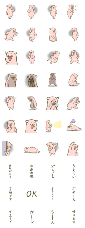 「ぶたの世界。」のアレンジ機能、組み合わせで使いやすいスタンプです。もちろんそのまま使ってもOK。ちょっとシュールな豚。手描き風ブタの世界をお楽しみください。