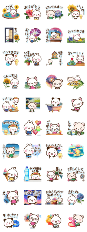 絵本みたいな水彩画風の使いやすい夏のお返事スタンプです♪かわいいパンダ・ひよこ・インコ・うさぎ・くま・猫が登場♪(暑い、天気、梅雨、向日葵、紫陽花、お誕生日)