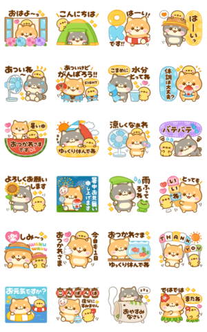 暑い夏に役立つ♡画面いっぱいに可愛く飛び出す小さな柴犬♡豆柴のまめちゃんくろちゃんのポップアップスタンプです。挨拶や相手を気遣う言葉が揃ってます♪