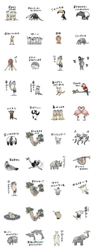 野生動物たちとハシビロコウの日常会話スタンプです。#ミナミコアリクイ #バク #オラウータン #カバ #ナマケモノ #モモンガ #アルマジロ #アライグマ