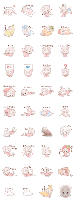 白くて小さい猫の女の子「ちびねこ女子」がひたすらになまけているスタンプです!やる気が出ない、のんびりしたい方にピッタリな日常で使えるセットです♪