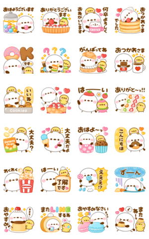 スイーツいっぱい!毎日使えるあいさつ言葉が揃ったかわいいシマエナガのポップアップスタンプです。ぴよたぬき♡ より発売