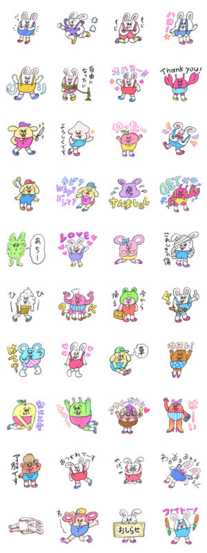 やけくそカレーパン太郎の流れで作ったウサギちゃんスタンプです。アサイーボウル、ザリガニ、桃、カヌレ、宇宙人なども登場。P太郎(ぴーたろう)