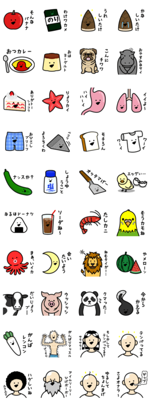 一見ベタなだじゃれ・親父ギャグかと思いきや、よく見るとイラストと食い違っているシュールな駄洒落スタンプ。トーク相手は間違いに気づいてつっこんでくれるだろうか?