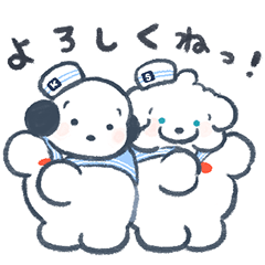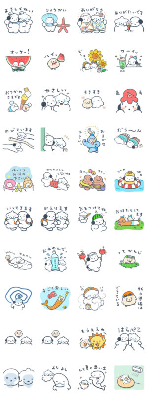 黒耳ココモとまふまふスモアはおだやかで健康な犬。もっちりした犬たちの夏のスタンプで暑さを楽しく乗り越えようっ穂の湯 より発売