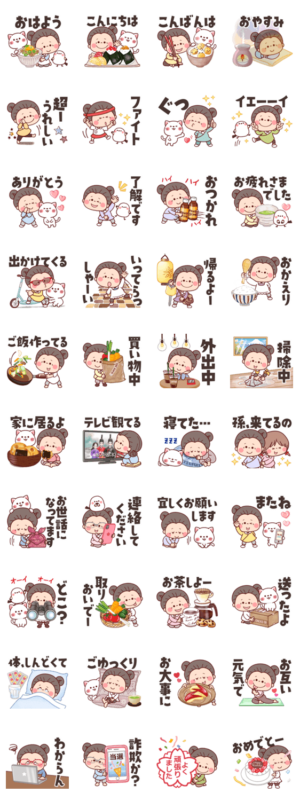 でか文字で見やすいシニア向けのかわいいスタンプ、プレゼントにも。おばあさん/主婦/友達/夫婦/孫/連絡/挨拶/日常会話/お団子/猫/シマエナガ/良く使う/家事/敬老の日