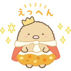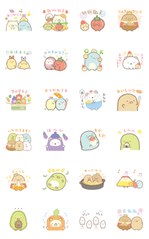 すみっコたちはのこりものがいつかたべてもらえることを夢みてあつまる「たべもの王国」へ♪たべものがたくさんのおいしそうなスタンプです。新キャラ「とんかつ王」登場!