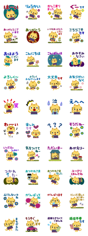 とらねこウニの毎日使えるスタンプです。 ありがとう、おつかれさま、よろしくなど、日常会話に使いやすい言葉を集めています。KAKKOBOX より発売