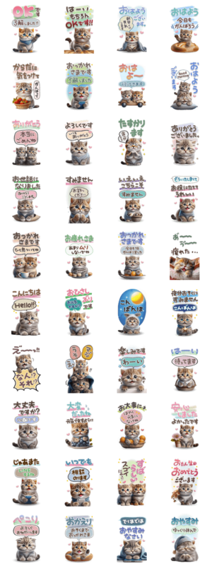 ねこちぃずの気持ちをたくさん伝えられる、優しい挨拶、長文スタンプです。