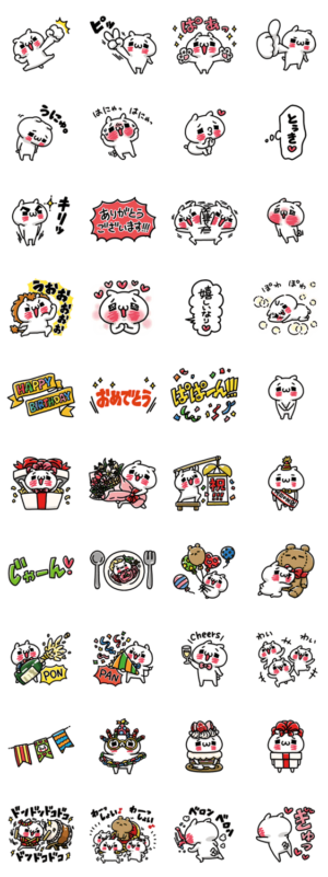 おめでたい時に使えるスタンプ満載!アレンジ機能で組み合わせて、にゃんこを並べたパーティー会場や、くまと組み合わせたオリジナルスタンプなど、色々作って楽しもう…!