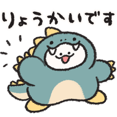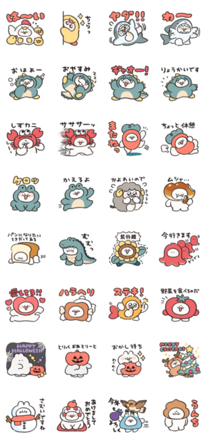 うさぎのぽてがかぶり物や着ぐるみを着たスタンプです。タヌキ シオリ より発売
