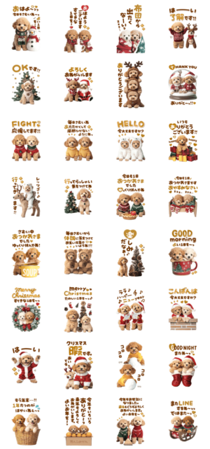 冬の挨拶・気遣い・クリスマス・年末のご挨拶まで♡いろんなメッセージや長文が入ったお得な冬のトイプードル達のスタンプです♪