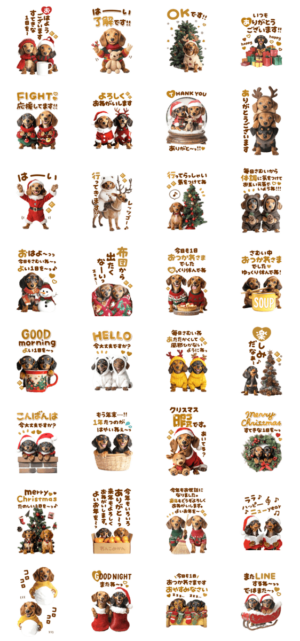 冬の挨拶・気遣い・クリスマス・年末のご挨拶まで♡いろんなメッセージや長文が入ったお得な冬のダックスフント達のスタンプです♪