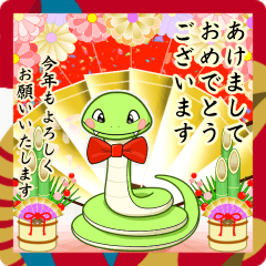 主役の巳を筆頭に恵比寿様、招き猫、鶴亀が舞い踊る年賀状です。年末の挨拶やクリスマス、誕生日のお祝いスタンプもあります。