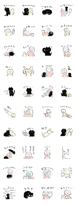 猫2匹と働く女性が日常をのんびり過ごす様子のLINEスタンプです。猫は白猫が「はくまい」、黒猫が「おこげ」と言います。冨田 マリー より発売