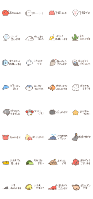 ゆるカワな海の生き物たちの省スペーススタンプです。グループトークに使いやすいゆるっとした敬語スタイル★サーーーモン より発売
