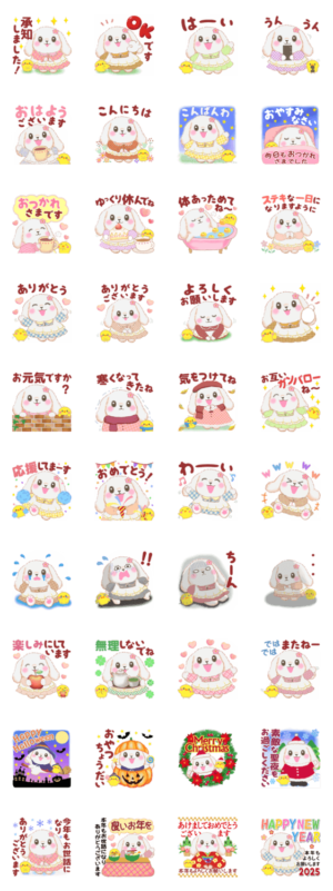 ハロウィン、クリスマス、お正月、秋から冬に活躍するたれ耳のかわいうさぎさんのスタンプです。めぐみん より発売