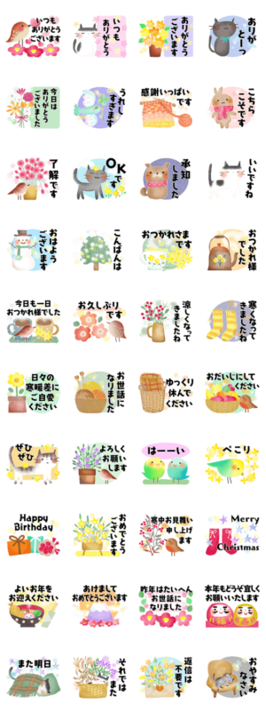 文字が大きくて見やすいサクッと送れる40個。シンプルで使いやすいほっこり優しいスタンプです。年末年始のご挨拶/年賀状/クリスマス/感謝の気持ち/日常/お祝い/猫/小鳥