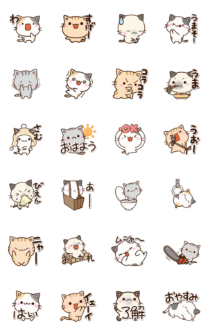 LINEマンガやKindleマンガでおなじみの『ちびネコ』。楽しく元気に動く5匹のちび猫の楽しいスタンプです。【かたこ】三毛・アメショ・ハチワレ・ねこ・かわいい
