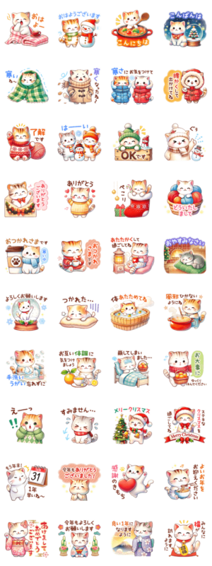 いろんなテイストのネコを集めた詰め合わせスタンプ。冬シーズンに使える便利なスタンプ♪ (ねこ・冬・寒い・正月・あけおめ・クリスマス・年末年始・敬語)Miho Kurosu より発売