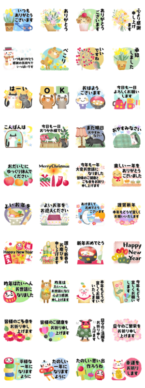文字が大きくて見やすいサクッと送れる40個。ほっこり優しい冬のご挨拶、感謝の気持ち、クリスマス、年末年始、年賀状など、ずっと使える思いやりのスタンプです。