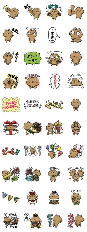 おめでたい時に使えるスタンプ満載!アレンジ機能で組み合わせて、くまを並べたパーティー会場や、にゃんこと組み合わせたオリジナルスタンプなど、色々作って楽しもう…!