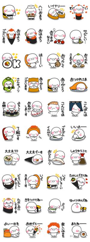 食べるの大好きなしろまるがお寿司と一体化!人気が高い基本形スタンプです。ずっと使える内容を揃えましたのでスタンプ初心者の方にもオススメです。【作:いしいともこ】