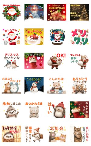 かわいいサンタクロースやキラキラおしゃれなクリスマスモチーフが沢山、クリスマスを盛り上げよう。日常の挨拶や12月に使えるスタンプも盛りだくさん。#忘年会 #帰省