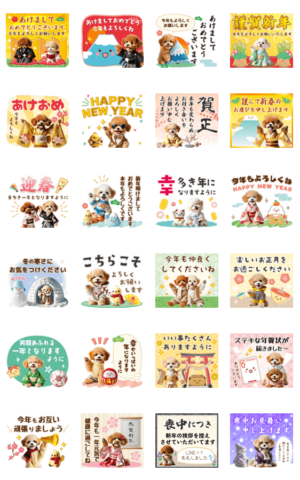 ▶飛び出る癒しプードルのおけおめ年賀状 スタンプ画像一覧