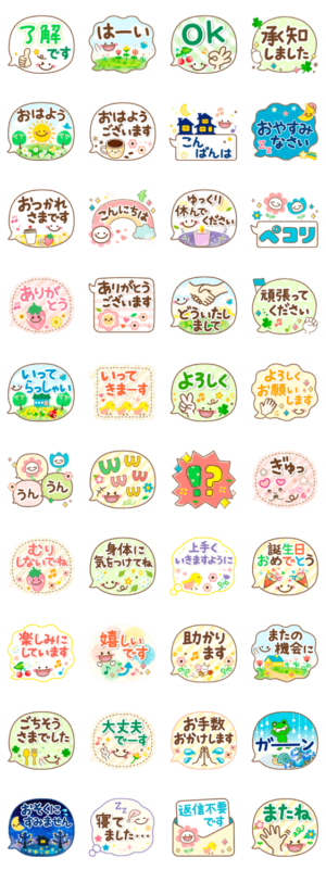 吹き出しの中に小さな幸せを詰めました。優しい色合いのイエローベースの春カラーに、普段使いしやすい言葉を合わせました。丁寧語・敬語を含むデカ文字の挨拶スタンプです