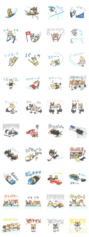 コーギーの冬の競技スタンプです。スキー、スノーボード、フィギュア・スピードスケート、カーリング、アイスホッケーなどなど。冬スポーツをコギで盛り上げていきましょう
