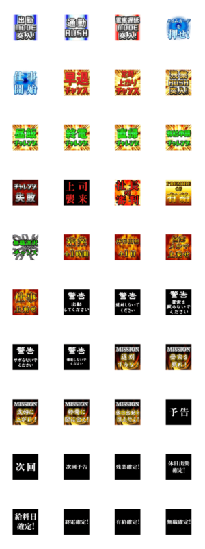 世界一忙しいと言われる日本のビジネスマン用スタンプです。 毎日残業、朝食も昼食も取れず休日出勤で楽しみは酒と休日のパチンコやスロットだけという忙しい男性向けに。STUDIO RISSEN より発売