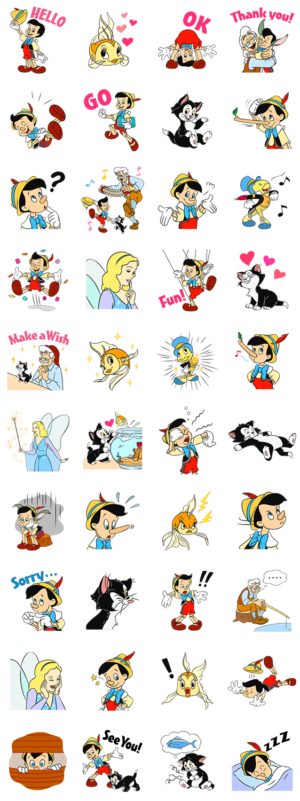 ディズニーアニメーション映画「ピノキオ」のスタンプが登場!ピノキオをはじめ、ゼペットさんや、猫のフィガロ、金魚のクレオたちが個性豊かな表情でトークを演出。