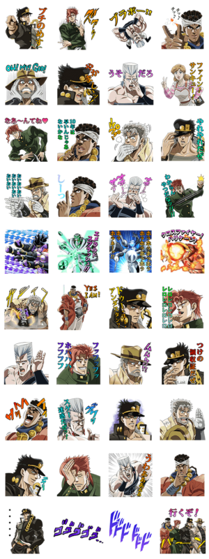 ジョジョの中でも知名度・完成度の高い第3部のスタンプ。キャラクターだけでなく擬音系のスタンプもあるのがありがたい。また味方チームのみのものであるため、DIO様やホルホースなどは出ないのでそこは注意。