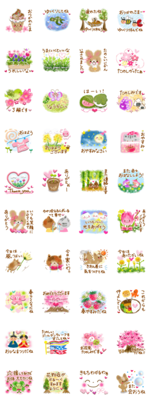 春に使うことを想定されているが、春以外でも使えるかわいらしくてポジティブなスタンプが多いので汎用性は低くない。しかしどうせ買うなら3~5月の旬は逃さないようにしたい。また、「きおん差に気をつけてね」などいくつかは秋にも使える。