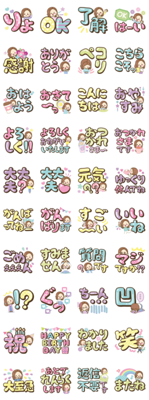 文字が大きくわかりやすい♥ぷくっとかわいいデコメ風文字のスタンプです。友達言葉や敬語もあり、若い方からシニア世代まで幅広くOK!デカ文字をお探しの方もオススメです紅おれんじ より発売